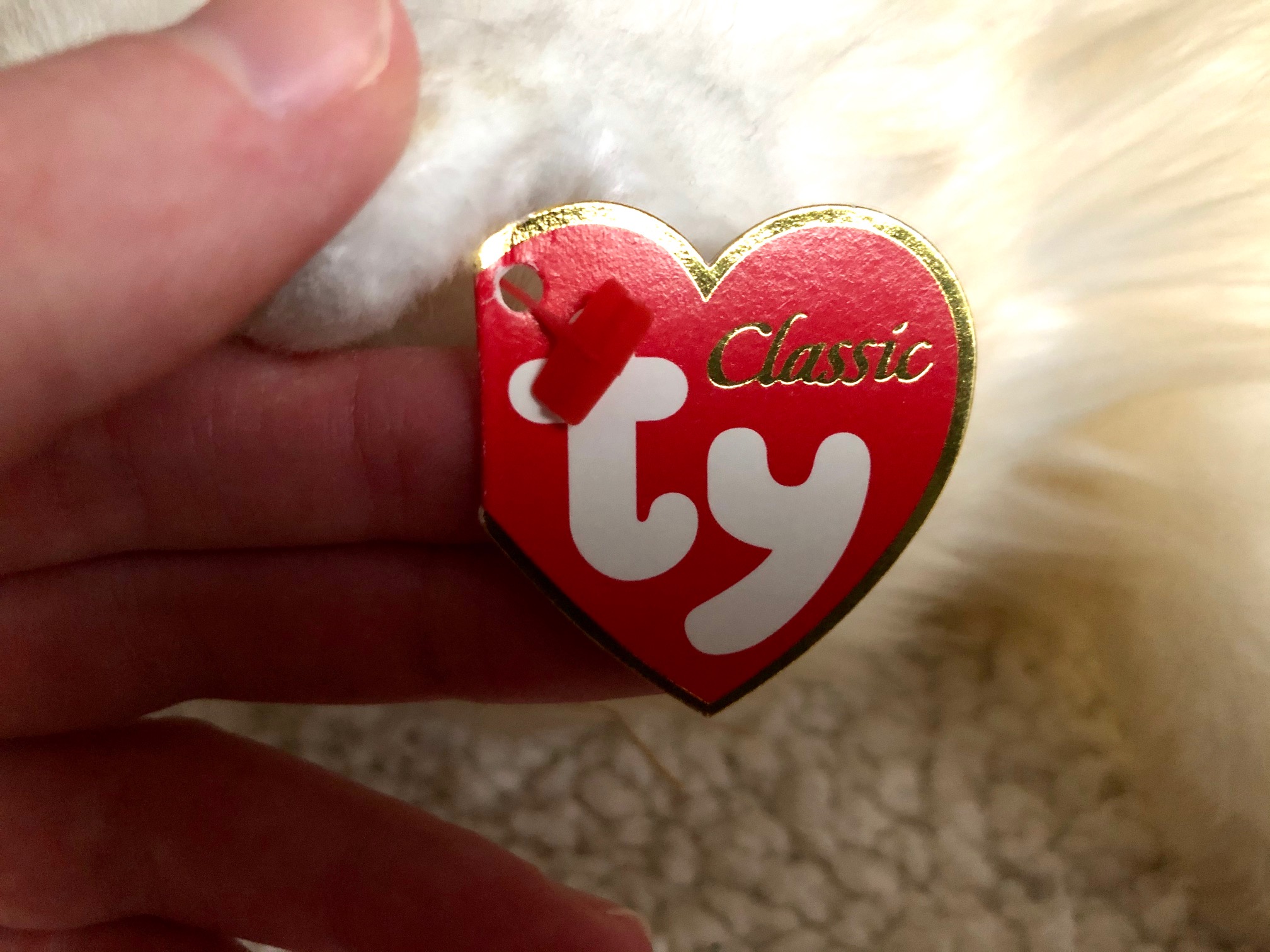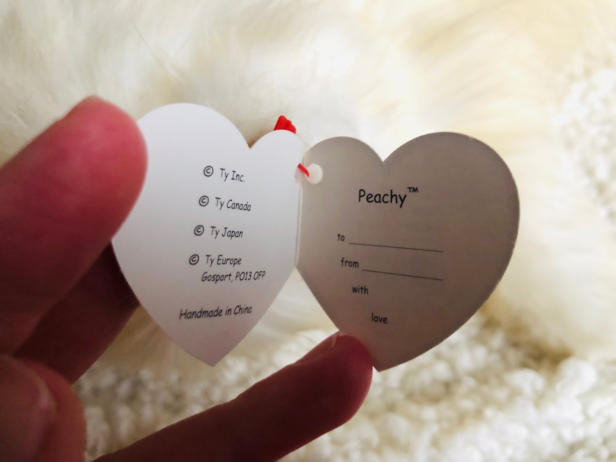 Peachy has a slightly different swing tag from the Beanie Babies range. Her swing tag is a 4th generation Ty Classic tag, which is the same red colour as Beanie Baby swing tags and still features the white “Ty” logo, but features the word “Classic” in gold foil to the upper right of the tag.